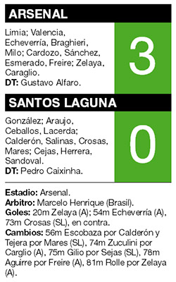 Arsenal salió a jugar frente a Santos Laguna con la tranquilidad de la clasificación como segundo del Grupo 8, que se aseguraron los mexicanos en la anteúltima fecha. Y jugó de entrada con la ansiedad de los visitantes, que fueron a buscar de entrada la victoria, con el incentivo de poder arrebatarle a Vélez el puesto de mejor clasificado de la tabla general de la primera fase de la competencia.