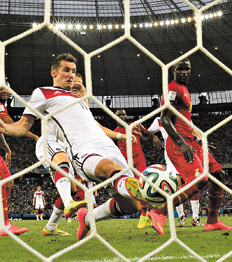 En la primera pelota que tocó en el Mundial, Miroslav Klose se convirtió en uno de los máximos goleadores de la historia de la Copa del Mundo. El único delantero neto de Alemania en Brasil sólo llevaba un minuto en el campo de juego en Fortaleza cuando le pegó el pisotón con la suela a la pelota, salvando a su equipo de la derrota ante Ghana. Cinco goles en Corea/Japón 2002, otros tantos en Alemania 2006 (incluido el del empate contra Argentina, antes de los penales), cuatro en Sudáfrica 2010 y éste de ayer ante Ghana elevan la cuenta a 15, la misma cantidad que Ronaldo. No son pocos, pudo ser alguno más...