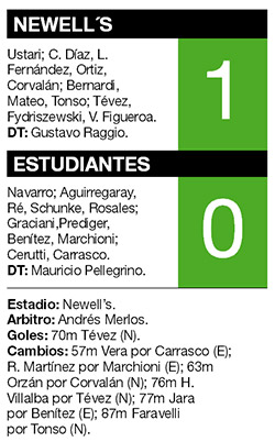 Con el gol del juvenil Mauricio Tévez, Newell’s derrotó ayer en Rosario a Estudiantes y quedó como único escolta del puntero Vélez. “Hicimos 80 minutos buenos, por momentos muy buenos, fuimos bastante precisos, jugamos como hace mucho no lo hacíamos y por eso logramos ganar”, explicó al final del partido el capitán de Newell’s Lucas Bernardi. Estudiantes, que no tuvo precisión en el contragolpe pero mejoró a partir de los ingresos del uruguayo Diego Vera y Leonardo Jara, ya espera el clásico de la ciudad de La Plata ante Gimnasia del próximo miércoles, por la Copa Sudamericana.