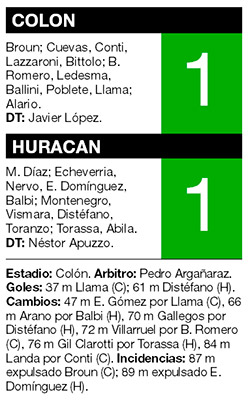 Colón y Huracán no se sacaron ventajas e igualaron en un partido de trámite parejo. Matías Ballini, volante central del conjunto local, terminó atajando los minutos finales del encuentro por la expulsión de Jorge Broun tras un error infantil en la salida. El equipo oriundo de Parque Patricios también terminó con diez hombres por la roja a Eduardo Domínguez. A pesar de que el conjunto santafesino no perdía hace seis fechas, Javier López, el entrenador, presentó su renuncia. Para Huracán la paridad significó la posibilidad de estirar su invicto a tres encuentros.
