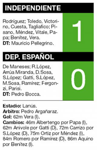 Independiente avanzó a octavos de final de la Copa Argentina al superar a Deportivo Español, que milita en la Primera B Metropolitana, con un cabezazo del uruguayo Diego Vera. Con este resultado, el conjunto de Avellaneda sumó su quinto triunfo consecutivo desde que Mauricio Pellegrino asumió el cargo de entrenador. En la próxima ronda enfrentará a Lanús, que viene de eliminar con comodidad a Chicago.