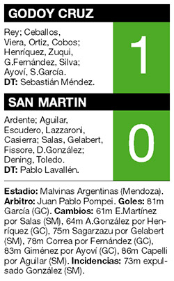 Godoy Cruz venció ayer a San Martín de San Juan por 1-0 y conservó su porción de la punta de la Zona 1 del torneo de Primera División, que comparte con San Lorenzo. El uruguayo Santiago García, a los 81 minutos, le dio la victoria al equipo mendocino en un encuentro en el que fue un poco mejor el Tomba, pero que también pudo haber sido para los sanjuaninos que estrellaron dos pelotas en los postes. Los visitantes terminaron con un hombre menos por la expulsión de Daniel González a los 73m.
