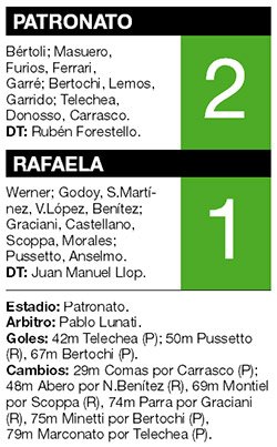 El clásico interzonal de la 13ra fecha del torneo de Primera División terminó en victoria para Patronato por 2-1, lo que le permitió al equipo de Rubén Forestello tomarse revancha de la derrota del encuentro jugado la semana pasada en Santa Fe. Telechea abrió la cuenta a los 42 minutos para los de Paraná, sin embargo la alegría duró poco porque a los 50 minutos Pussetto anotó la igualdad. Patronato jugaba un poco mejor que la visita y así, a los 67 minutos, gracias a un tanto de Bertochi, logró nuevamente la ventaja que cuidó hasta el último minuto para quedarse con la victoria que le da un poco de aire en la lucha por mantener la categoría.