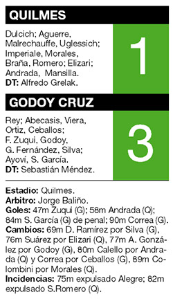 Godoy Cruz quedó como único puntero de la zona 1 del torneo de Transición 2016 de fútbol de Primera División, al vencer anoche como visitante 3-1 a Quilmes. Fernando Zuqui, Santiago García, de penal, y Javier Correa, todos en el segundo tiempo, anotaron los goles del conjunto mendocino; Federico Andrada había empatado transitoriamente para Quilmes, que terminó con nueve jugadores por la expulsión de Alan Aguerre y Sebastián Romero. Con la victoria, Godoy Cruz suma 30 unidades en la cima de la zona 1 y le sacó tres puntos a San Lorenzo, que hoy recibirá a River en el Nuevo Gasómetro.