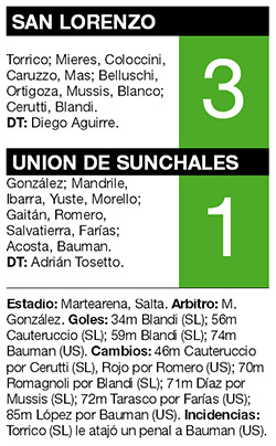 San Lorenzo derrotó ayer 3-1 a Unión de Sunchales, en Salta, y avanzó a los 16avos. de final de la Copa Argentina. Los goles del equipo que dirige Diego Aguirre fueron marcados por Nicolás Blandi, en dos oportunidades, y Martín Cauteruccio. Mientras que Jonatan Bauman, tras el rebote del penal que había atajado Sebastián Torrico, descontó. El encuentro marcó el debut del entrenador uruguayo al frente del conjunto de Boedo, que en la próxima instancia se medirá con Douglas Haig de Pergamino.