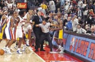 En uno de los espectáculos más penosos de la historia de la NBA, jugadores de Detroit Pistons e Indiana Pacers se trenzaron en la noche del viernes en una batalla campal que se extendió a las tribunas y obligó a suspender el partido cuando restaban 45 segundos para el final y los Pacers ganaban 97-82, en un hecho inédito en la historia de la Liga. Como consecuencia de la pelea, la NBA sancionó por tiempo indefinido a los jugadores Ron Artest, Jermaine O’Neal, Stephen Jackson y Ben Wallace, los principales involucrados en el escándalo. La trifulca dejó varias personas lesionadas, entre ellas uno de los árbitros del encuentro.