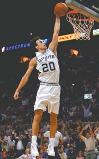 Apenas cuatro segundos transcurrieron desde el inicio del encuentro hasta que Ginóbili anotó su primer doble. El bahiense recibió de Tim Duncan y se mandó directamente al aro para convertir los puntos. Luego, San Antonio repartió muy bien su goleo para sacar ventajas que oscilaron entre los siete y los diez puntos. Mucho influyó para ello un minuto mágico de Ginóbili, que robó dos pelotas seguidas, anotó dos dobles en contragolpe y entregó una asistencia. Igualmente, pese a las once unidades que llevaba en ese primer tiempo, el principal aporte de Manu fue en defensa, con cuatro robos, tres rebotes y una tapa.