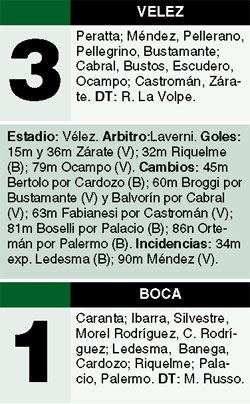 Boca mejoraba, pero seguía siendo menos que Vélez, al menos hasta que Riquelme, en jugada de tiro de esquina, encontró la igualdad, a los 32. Pudo haber sido olímpico el gol, pero lo cierto es que la pelota se desvió en Bustos y entró por el primer palo. El 1-1 obligaba a Vélez a marcar cuatro goles más para pasar de ronda. Parecía difícil hasta que, dos minutos más tarde, Saúl Laverni le mostró la roja a Ledesma por una falta sobre Bustamante. Y, otros dos minutos más tarde, habilitado por un pase largo de Cabral, Zárate quedó mano a mano con Caranta para definir con cara interna de la pierna derecha al palo izquierdo del arquero, que iba a lucirse poco después con dos atajadas espectaculares a Castromán y Ocampo. Tras el descanso, Vélez bajó un poco la producción, aunque siguió arrimando peligro. Boca creció con Riquelme, que comenzó a tener la pelota y hasta metió dos disparos contra el travesaño de Peratta. Vélez, por su parte, sólo miraba el arco de Boca, donde Caranta se lucía cada vez más exigido. El gol de Ocampo, a los 79, una avivada del pibe que luchó una pelota que parecía perdida y terminó picándola por encima del arquero para meterla en el ángulo del primer palo, acercó a los locales al partido soñado. Faltaban sólo dos goles: Boca aguantó como pudo y Vélez los buscó hasta la desesperación. No llegaron, y Boca festejó atragantado la clasificación, mientras los jugadores de Vélez recibían el largo aplauso de sus hinchas.