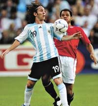 Parado a jugar de enganche en la primera mitad, Lionel Messi no pesó, rodeado permanentemente por tres o cuatro camisetas rojas, que no le ahorraron marca recia, sin establecer conexión con Maxi Rodríguez o los delanteros. Se adelantó en el complemento, se entendió mejor con Saviola (tiraron una pared que el Pibito remató afuera) y se encendió con un disparo desviado, confirmando que, cuando se enciende, el equipo argentino siente revivir sus esperanzas.