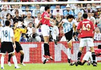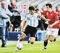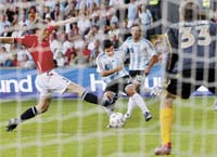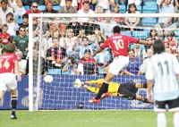 Noruega se había plantado con un esquema muy conservador y Argentina manejaba la pelota cuando Mascherano le cometió penal a Riise que Carew transformó en el 1-0 (foto). Con la ventaja, los noruegos se adueñaron del partido y justificaron la diferencia ante una Selección muy dubitativa, con problemas para recuperar el balón y dificultades para hacérsela llegar a los delanteros.