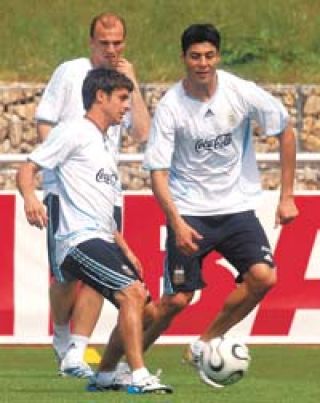 Aunque el entrenamiento fue a puertas cerradas, se supo que José Pekerman probó a Pablo Aimar, Julio Cruz (ambos en la foto) y Gabriel Milito, que serían titulares mañana contra Holanda. Otra versión que circuló fue la de que Lionel Messi jugará al menos 30 minutos. Pekerman practicó movimientos tácticos con los futbolistas con tres equipos de seis o siete jugadores, pero recién hoy, después del último entrenamiento, confirmará el equipo. Por la tarde, la Selección viajará a Francfort en micro.