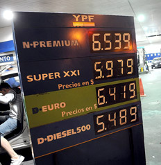 En la actualidad, si se calcula el precio en dólares, las naftas están más caras que durante la convertibilidad. A fines de 2001, Repsol YPF cobraba la variedad premium 1,104 peso/dólar y ahora cuesta 6,539 (1,37 dólar), un 24 por ciento más. Shell, por su parte, vendía la V-Power a 1,12 peso/dólar, mientras que hoy cotiza a 6,599 (1,39 dólar), 24,1 por ciento más. Igual la diferencia es escasa si se toma en cuenta cómo evolucionó el barril de crudo. Hace diez años costaba 20 dólares y ahora está cerca de 90 dólares. La intervención del Estado es lo que evitó que el precio local de la nafta se disparara aún más y motivó un duro enfrentamiento con las petroleras, las cuales reclamaron que el precio en el mercado local estuviera en línea con la cotización internacional del crudo.