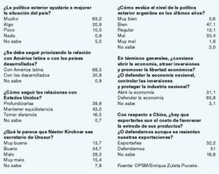 Un encuesta realizada esta semana por el estudio OPSM, que dirige Enrique Zuleta Puceiro, mostró un claro respaldo a la política exterior argentina en términos de su influencia sobre la economía. El estudio, realizado a nivel nacional en 65 localidades, mostró que una mayoría tiene conciencia sobre cómo las relaciones con el mundo influyen en la situación local, considera oportuno que Néstor Kirchner sea secretario de Unasur y sostiene que es mejor invertir en las relaciones con América Latina manteniendo distancia con Estados Unidos. Una clara mayoría prefirió que se defienda la industria nacional y se ponga límites a las importaciones de países como China, aun a costa de posibles conflictos con nuestras exportaciones.