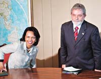 Rice hizo una didáctica defensa del concepto de ataque preventivo, estrenado por EE.UU. en Irak en marzo de 2003 y emulado por Colombia el 1º de marzo de 2008, al decir que Alvaro Uribe estaba en su derecho cuando bombardeó a las FARC más allá de sus fronteras. Un reportero la consultó sobre el proyecto de Consejo de Defensa Sudamericano impulsado por Lula como una alternativa al Tratado Interamericano de Defensa Recíproca, nacido durante la Guerra Fría bajo los designios norteamericanos. Diplomática, la funcionaria no criticó la idea de Lula, que despierta recelos en Washington, y dijo que podía ser un instrumento en la guerra contra las amenazas que asuelan la región. “No vemos problemas en esa propuesta y confiamos en el liderazgo de Brasil, somos favorables a cualquier tipo de cooperación regional y es siempre bueno mejorar los instrumentos para enfrentar las crisis”.