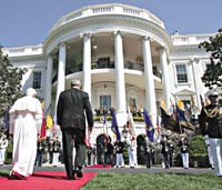 Benedicto XVI fue recibido por Bush en los jardines de la Casa Blanca con una espectacular ceremonia a la que asistieron unas 13 mil personas. Durante su posterior encuentro en la Casa Blanca, el Santo Padre y el mandatario, entre los varios temas que abordaron, denunciaron “la manipulación” de la religión para justificar el terrorismo.