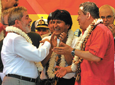 Morales agradeció la ayuda financiera de Brasilia y Caracas y dijo que antes los créditos para financiar infraestructura para el transporte venían de organismos de crédito que a cambio exigían la privatización del servicio. Elogios para Evo a pocos días del plebiscito.