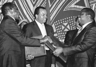 Por primera vez en 28 años de control férreo en el país, el octogenario presidente de Zimbabwe, Robert Mugabe (izq.), cede poder. Tras meses de negociaciones, auspiciadas por el presidente de Sudáfrica, Thabo Mbeki, Mugabe y los dos principales líderes de la oposición, Morgan Tsvangirai (der.) y Arthur Mutambara, firmaron el acuerdo para la formación de un gobierno de unidad nacional, cuyo objetivo inmediato es el de sacar de la bancarrota al país, con una inflación anual calculada de 11 millones por ciento y con un 80 por ciento de la población en el paro. Mugabe se mantiene como presidente del país y seguirá al mando del ejército, mientras Tsvangirai será primer ministro y se hará con el control de las fuerzas policiales, tras el desmantelamiento del Ministerio para la Seguridad del Estado.