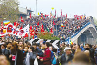 “Es posible otra Europa”, “Tomen su guerra y váyanse al infierno”, eran otras de las consignas de las pancartas que llevaban los manifestantes, jóvenes italianos en su mayoría, que llegaron en trenes desde todos los rincones de Italia, convocados por los movimientos antiglobalización reunidos en el Foro Social Europeo, iniciado hace cuatro días de acuerdo al modelo del Foro Social Mundial celebrado en enero del 2001 en la ciudad brasileña de Porto Alegre. En un ambiente festivo, con música y cantos como telón de fondo, los manifestantes agitaron banderas y carteles en varios idiomas en los que reflejaron su “no” decidido a un ataque militar contra Irak e invitaron a todos a condenar la guerra.