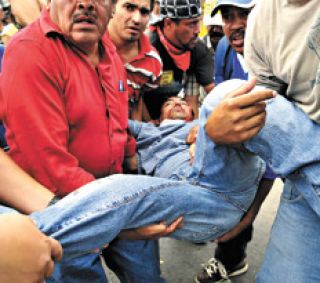 La dictadura de Honduras salió ayer a reprimir con todo. Como cada día desde el golpe de Estado del 28 de junio, cientos de manifestantes agrupados en el Frente Nacional de Resistencia salieron a protestar a las calles de Tegucigalpa. Pero esta vez el asfalto terminó lleno de sangre. “Llegaron unos 800 policías y militares. Y ahí nomás nos empezaron a apalear con una brutalidad increíble. Cuando vieron que resistíamos, se empezaron a oír disparos”, le dijo a Página/12 vía telefónica desde la comisaría 4ª del barrio de Belén en Tegucigalpa Juan Barahona, dirigente del Bloque Popular que fue detenido por la policía. “Nos golpearon como nunca lo habían hecho. Nos trataron como animales. Pero estos oligarcas no van a poder aplastar al pueblo”, aseguró el dirigente. El maestro de escuela Roger Vallejos recibió un balazo en la cabeza y fue llevado al Hospital Escuela de la zona para ingresar inmediatamente al quirófano. Según versiones no confirmadas al cierre de esta edición, Vallejos ya habría muerto. Al menos 250 personas fueron detenidas, entre ellas Carlos Reyes, dirigente popular y candidato independiente a las elecciones presidenciales de noviembre, que terminó con siete puntos en la cabeza. Hay decenas de heridos, seis de ellos de gravedad.