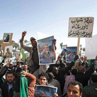 La Plaza Verde de Trípoli fue campo de juego exclusivamente de manifestaciones de apoyo incondicional a Khadafi, impulsadas por centenares de libios. Allí acudieron militares, funcionarios de gobierno y policías, convocados a través de Internet. El gobierno ordenó el cierre de escuelas para animar a los alumnos a sumarse a esas manifestaciones.