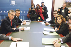 Las fuentes del PP que informaron del encuentro no dieron otros detalles más que anticipar nuevas entrevistas entre Rajoy y Zapatero en los próximos días, sobre todo para consensuar la posición internacional de España en distintas cuestiones, pero sobre todo respecto de su crisis de deuda. La reunión no anunciada entre Rajoy-Zapatero llegó horas después de otro previsto encuentro en La Moncloa entre el actual gobierno y un equipo del presidente electo que marcó el inicio oficial del proceso de transición. En esa reunión matinal, encabezada por el vicepresidente Ramón Jáuregui y Soraya Sáenz de Santamaría, encargada por Rajoy de dirigir el traspaso de poderes, las partes acordaron que el PP será informado de todos los asuntos de gobierno. Jáuregui y De Santamaría también se comprometieron a consensuar la posición de España en las próximas cumbres internacionales, entre ellas la de la UE del 9 de diciembre. Sin embargo, pese a la fuerte presión de los mercados y del establishment comunitario, el PP insistió en que aún no se revelarán los planes de gobierno hasta que se realice el debate de investidura en el Congreso. Mientras tanto, el riesgo país sigue en alza, en torno de los 467 puntos básicos, y el Tesoro Público tuvo que pagar un interés record, del 6,16 por ciento, para títulos con vencimiento a cinco años. A la presión incesante de los mercados se sumó en la víspera la canciller alemana, Angela Merkel, quien pidió a Rajoy que implemente sin demora las medidas necesarias para evitar un agravamiento de la crisis de deuda que padece España, lo que profundizaría los problemas de otros países de la Zona Euro.