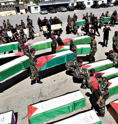 La ceremonia militar estuvo encabezada por el presidente, Mahmud Abbas, quien depositó coronas de flores sobre los ataúdes envueltos en banderas palestinas. Más de dos centenares de personas, que portaban enseñas palestinas y del partido Al Fatah, participaron en el acto, en el que el mufti de Jerusalén, Mohamed Hussein, pronunció una oración fúnebre antes de que los familiares recibieran los restos para darles sepultura en sus pueblos de origen.