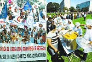 Más al norte, en Brasilia, el Sindicato Nacional de la Empresa Brasileña de Investigación Agropecuaria organizó “el almuerzo más grande del mundo” para exigir un aumento de salarios y fondos para la investigación agropecuaria. Según la presidenta del sindicato, Salma Beltrao, en lo que va del año el gobierno ha liberado apenas el 10 por ciento de los 164 millones de reales (unos 57,5 millones de dólares) del presupuesto destinado a esta área. Para el almuerzo, se improvisó una mesa de 630 metros de largo en la Explanada de los Ministerios, la avenida en la que están todos los ministerios, el Palacio de Gobierno y las sedes de los poderes Legislativo y Judicial. En la mesa sirvieron comida para unas 4000 personas, que consumieron casi tres toneladas de arroz, porotos, papas, carne y maíz. Con esta original protesta, los sindicalistas quieren entrar en el Libro Guinness de los Records con “el almuerzo al aire libre más grande” que se haya servido en la historia. También en San Pablo cientos de trabajadores protestaron contra las políticas del Banco Central.