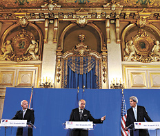 Francia, Estados Unidos y Gran Bretaña pactaron en París una línea convergente con la meta de remitir esta semana ante el Consejo de Seguridad de las Naciones Unidas una “resolución fuerte, robusta, que prevé plazos precisos, con un calendario y obligatoria para el régimen sirio”. El presidente francés, François Hollande, reunió en el palacio presidencial al secretario de Estado norteamericano, John Kerry; al secretario del Foreign Office, William Hague, y al ministro francés de Relaciones Exteriores, Laurent Fabius. Las tres potencias decidieron acentuar la presión en torno del presidente sirio Bashar al Assad para que éste respete los términos del acuerdo de Ginebra sobre el desmantelamiento del arsenal químico sirio.