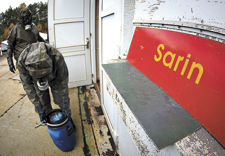 Ensayo en Munster, Alemania, para el manejo de armas químicas.Siria destruyó sus equipos para producir armas químicas y municiones de gas venenoso y puso bajo sello inviolable la totalidad de sus preexistentes agentes tóxicos y armas químicas, un hito en el ambicioso proceso que busca inutilizar todo ese arsenal para mediados de 2014.