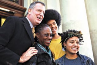 La posición de De Blasio contra su antecesor, el multimillonario de Wall Street Michael Bloomberg, que gobernó la ciudad durante 12 años, le permitió captar un apoyo histórico entre los votantes. Algunas encuestas le adjudicaban un 68 por ciento de respaldo de durante la campaña. Este demócrata que dirigió la campaña de Hillary Clinton al Senado se presentó ante el electorado como el único con los pantalones para romper con los años de Bloomberg, a quien ataca por ser un millonario elitista que gobernó para los ricos y defendió vehementemente al sector financiero, inclusive después de la crisis de 2008.