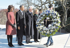 El presidente de Estados Unidos, Barack Obama, encabezó ayer una jornada de tributos al ex mandatario John F. Kennedy, a 50 años de su asesinato, con una emotiva visita a su tumba y la entrega de la Medalla Presidencial de la Libertad a personalidades destacadas. Dos días antes del 50º aniversario del crimen que conmocionó al mundo, Obama y su mujer, Michelle, acompañados por el ex presidente Bill Clinton y su esposa, Hillary, se dirigieron al Cementerio Nacional de Arlington y colocaron una ofrenda floral ante la llama eterna que marca la tumba de Kennedy. Obama y Bill Clinton tomaron de la mano a Ethel Kennedy, viuda de Robert Kennedy, el también asesinado hermano de JFK, mientras subían unas escalinatas hacia la llama eterna, adonde se les sumaron sus esposas para colocar una corona de flores azules y blancas unos metros por delante de la tumba.