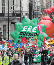 En un intento por detener la deuda y el lento crecimiento del país, en octubre de 2010 el gobierno aplicó medidas de austeridad con importantes recortes en los ministerios producto de la crisis económica. Desde entonces, la decisión provocó numerosas protestas. El TUC destaca que el poder adquisitivo de los trabajadores está en su peor momento desde el 2008 cuando se inició la crisis.