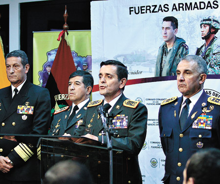 Los jefes militares en una conferencia de prensa ayer, antes de ser echados por Correa.El presidente ecuatoriano, Rafael Correa, relevó a la conducción de las fuerzas armadas por entrometerse en la decisión del Ejecutivo de exigir la devolución de 41 millones de dólares al Ministerio de Medio Ambiente. El mandatario tomó la decisión tras la polémica que se desató cuando el gobierno ordenó la devolución de un sobreprecio obtenido por el Instituto de Seguridad Social de las Fuerzas Armadas (Isfaa) en la venta de unos terrenos en la ciudad de Guayaquil, donde el Ministerio del Ambiente construyó un gran parque recreativo.