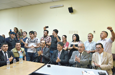 Entonces, el tribunal ordenó un receso de diez minutos. Al retomar la audiencia, la bronca contra los jueces continuaba. Amelio Sisco, abogado defensor, se había quejado porque la audiencia no era traducida al guaraní y el juez Zelaya amenazó con apercibirlo. La secretaria del juzgado voceó finalmente la lectura de las penas. Los abogados, familiares y militantes golpeaban los bancos de la sala y cantaban: “Arriba, abajo, jueces al carajo”.