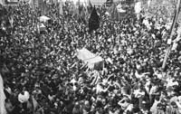 Siete horas más tarde, en el cementerio de los Mártires del barrio del Jeque Raduan, al otro lado de la ciudad de Gaza, eran enterrados los restos de Yassin y los de las otras ocho víctimas. Una masa enfervorizada, que enarbolaba banderas de todos los partidos, y entre los que se paseaban jóvenes armados con el rostro tapado, acompañaron los féretros hasta lo alto de la colina.