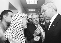 Fuentes palestinas informaron luego que Arafat expresó a Powell su “preocupación” por los sufrimientos padecidos por los palestinos, especialmente en Jenín, y reiteró la línea seguida por la dirigencia palestina: no habrá alto el fuego ni conversaciones hasta que Israel no se vaya de los territorios que ocupa desde el pasado 29 de marzo. Mohammad Dahlán, jefe de la Seguridad Preventiva de Gaza, asistió a la entrevista y reveló a la prensa que la posición de los palestinos no varió: no habrá conversaciones con Israel, ni coordinación para la seguridad, ni alto el fuego sin una retirada total de las fuerzas israelíes de los territorios palestinos. Este reclamo concierne exclusivamente las ciudades invadidas por Israel en el transcurso de la operación Muro Defensivo. Según Dahlán, las entrevistas se centraron en tres puntos: análisis de la situación política y su eventual desbloqueo, el tema de la seguridad y el “colapso económico” en los territorios palestinos, en especial los eventuales aportes de la comunidad internacional para “subsanar” todo cuanto “los israelíes destruyeron durante el operativo”.