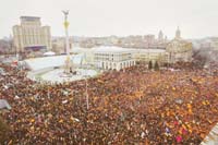 “Lo que empezamos hoy debe ser defendido todos los días”, dijo. “Les urgimos que vengan a la plaza en estas cantidades. Mañana el país los necesitará especialmente.” Ayer, la Revolución Naranja ucraniana (así llamada por el color opositor) encontró lo que podría ser su momento definitorio, mientras las enormes manifestaciones antigubernamentales se expandían de Kiev a otras ciudades. Al tiempo que el líder de la oposición simbólicamente se autoproclamaba presidente, el gobierno se preparaba para enfrentar el desafío, mediante la fuerza si era necesario.