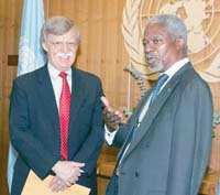 John Bolton se estrenó ayer como nuevo embajador estadounidense en el Consejo de Seguridad haciendo causa común con su homólogo chino, Wang Guangya, para tumbar la futura ampliación de los cinco miembros permanentes de este órgano en los términos propuestos por el G4 –Alemania, Japón, Brasil e India– y los países de la Unión Africana (UA).