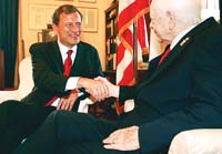 El Comité Judicial del Senado confirmó ayer la nominación de John Roberts (foto, izq.) a la Corte Suprema, logrando así una victoria para el presidente Bush. Este paso asegura que el juez federal de Corte de Apelaciones de 51 años será cómodamente confirmado por el Senado como el 17º presidente de la Corte Suprema de Justicia de EE.UU. La confirmación del comité de 18 miembros se produce a pesar de las quejas ampliamente difundidas por demócratas que dicen que Roberts no fue abierto en los puntos de vista que expresó al comité acerca de temas hipersensibles como el aborto y la relación entre la religión y el Estado.
