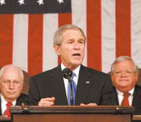 En su discurso anual en el Capitolio, el presidente norteamericano pidió que se renueve la Ley Patriótica que aumenta el control de inteligencia sobre la población, y subrayó que una retirada de Irak dejaría a Bin Laden y Al Zarqawi como dueños de ese país. Anunció el recorte de impuestos y la búsqueda de nuevas tecnologías que reemplacen al petróleo.