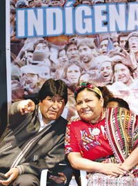 Ahora en el poder, el líder indígena destacó como alternativa para profundizar la democracia a la Asamblea Constituyente, un organismo que sin embargo no ha podido redactar ni una línea en 14 meses de sesiones después de que el oficialismo aceptara regirse por el sistema de mayoría con dos tercios en respuesta a una exigencia de la oposición. “Estoy convencido de que este nuevo milenio debe ser una democracia no sólo con inclusión social profunda, sino que los pueblos deben tener el poder de decidir los destinos del país”, afirmó ayer Morales, que asumió en enero de 2006 con 54 por ciento de los votos en un país donde aún persisten altos niveles de pobreza y concentración de la riqueza.