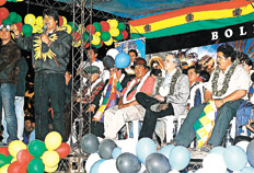 Durante el acto, Evo se refirió a otro de sus oponentes: el gobierno de Estados Unidos (ver página 20), que junto a los partidos políticos tradicionales constituyen “los enemigos históricos de la patria”, según el presidente. Tras acusarlos de “conspiradores”, Evo pidió a sus bases que recordaran el grito quechua para resistir a las políticas de erradicación de la hoja de coca financiadas por EE.UU.: “¡Causachun coca! (viva la coca) ¡Wañuchun yanquis! (abajo los yanquis)”. En su primer acto de esta campaña, el presidente sostuvo que los prefectos opositores “no quieren que se recuperen los recursos naturales, no quieren que estos recursos vuelvan a manos del pueblo boliviano”. Por eso les pidió “no sabotear” el referéndum del 10 de agosto.