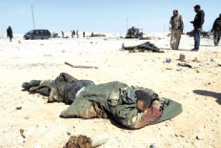 Las razones por las que los leales a Khadafi abandonaron el plan de lucha son demasiado evidentes. Por segunda semana consecutiva, había cuerpos que yacían desparramados, quemados y desmembrados entre tanques y camiones, en interminables campos de matorrales. Lo que cambió desde la última semana fue la cantidad de municiones y de artillería con la que contaban, con lo cual simplemente abandonaron sus puestos.