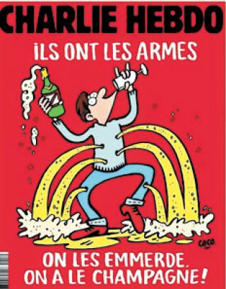 “Ellos tienen las armas, que se jodan, nosotros el champagne”: el dibujo de tapa del número de Charlie Hebdo que se publicará hoy es una respuesta directa a los atentados de París por parte de la redacción del semanario satírico, diezmada por un ataque jihadista el 7 de enero. Un hombre que bebe y baila con el cuerpo baleado y una botella de champagne en la mano desafía a los autores de los atentados que tuvieron por blanco lugares festivos de la capital francesa. La dibujante Coco lo representa con fondo rojo y el alcohol que surge de los agujeros causados por las balas. “Sangre y lágrimas, profetizaba Churchill. En eso estamos”, escribe esta semana el redactor en jefe de la revista, Riss, en su editorial.