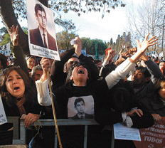 A las cinco en punto ingresaron los imputados. No volaba una mosca. Igual que el primer día, una cinta negra cubría la escarapela de la solapa del saco de Menéndez, de luto por el fin de su impunidad. Los abogados de H.I.J.O.S. adornaron sus pupitres con las fotos de sus seres queridos. Martín Fresneda con la de sus padres caídos, Tomás y Mercedes Argañaraz, con la abuela Otilia, que los crió con infinito amor. Claudio Orosz con la de sus ex compañeros del colegio Manuel Belgrano: Pablo Schmucler, Claudio Román y Gustavo Torres, todos desaparecidos.