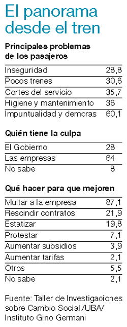 –El 37 por ciento de los encuestados propone “multar a la empresa”; el 22, “rescindir los contratos”. Es decir que en su mayoría plantean aplicar los mecanismos reglamentarios existentes. Y una minoría que no deja de ser importante, próxima al 20 por ciento, plantea “estatizar el servicio”. Quiero destacar también que la gran mayoría de los usuarios toma el tren para ir a trabajar: el 86,4. Esto podría parecer una obviedad, pero hay que observar que los problemas en los trenes producen alteraciones importantes en la economía de la población: pierden el presentismo, pierden horas remuneradas. No es simplemente viajar incómodo. Y algo que aumenta el malestar es el anuncio del tren bala: a los usuarios los indigna porque ellos probablemente no viajen nunca en el tren bala, pero están condenados a viajar toda la vida en estos trenes.