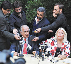 Gil Lavedra llegará temprano hasta La Plata junto a sus correligionarios Gerardo Morales, titular del comité nacional de la UCR, y Daniel Salvador, jefe del radicalismo bonaerense. Allí presentará un escrito en el que tratará de poner en duda la conformación definitiva de la lista provincial del Frente para la Victoria. El cuestionamiento a la candidatura de Kirchner “no será una impugnación directa”, sino que le pedirá al juez “que se cerciore de qué manera obtuvo el domicilio” en la provincia, especificó el ex camarista. Gil Lavedra sí cargó directamente contra Scioli y Massa. “Debería renunciar porque el artículo 73 de la Constitución impide a los gobernadores ser diputados”, y la sola postulación “implica el compromiso intrínseco de asumir el cargo”, dijo sobre el mandatario provincial. “Lo de Massa –continuó Gil Lavedra– me parece una cosa escandalosa, porque es intendente de Tigre, con uso de licencia, es jefe de Gabinete, y ahora es candidato a diputado nacional... es mucho.”