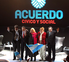 Cinco modernos sillones de cuero negro, cinco modernas copas de cristal y tres modernas mesitas blancas. Unos 600 participantes, pochoclos, una pantalla gigante y un escenario en un auditorio del barrio porteño de Recoleta. Así, lejos de toda tradición política, el Acuerdo Cívico y Social realizó ayer su cierre de campaña con una suerte de reportaje abierto a sus más importantes candidatos a diputados nacionales. Alfonso Prat Gay y Elisa Carrió (Capital Federal), Margarita Stolbizer y Ricardo Alfonsín (Buenos Aires) y Gerardo Morales como presidente de la UCR –en reemplazo de Ricardo Gil Lavedra, quien faltó por un problema personal– mandaron un fuerte mensaje triunfalista a pesar de los números que arrojan las últimas encuestas. “Vamos a ganar, claro, transparente, vamos a ganar de La Quiaca a Ushuaia en toda la nación”, se envalentonó Carrió en un acto que apuntó de lleno al kirchnerismo, pero no ahorró críticas a los candidatos de Unión-PRO.