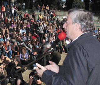 El ex mandatario llegó al Parque Lezama acompañado por el secretario de la Función Pública, Juan Manuel Abal Medina (h), el diputado provincial Fernando “Chino” Navarro y el titular de la SIDE, Héctor Icazuriaga. Su llegada sorprendió a la mayoría de los asistentes, salvo a algunos integrantes del grupo fundador de Carta Abierta que habían sido advertidos sobre una probable visita suya. En su primera actividad pública tras la derrota del 28 de junio y la renuncia a la conducción del PJ, Kirchner dijo que había decidido ser candidato a diputado porque algunos sectores estaban “tratando de debilitar la institucionalidad y la gobernabilidad”. “Creí que había que poner todo, sin especular, para defender y evitar lo que se estaba construyendo en la Argentina”, dijo. Enseguida convocó a “mantener la lucha y la fe”; luego insistió en que saldrá a recorrer el país “para seguir trabajando por esos principios”.