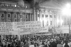Desde las cinco de la tarde, frente al Congreso una concentración respaldó el proyecto de ley de Servicios de Comunicación Audiovisual. Movimientos sociales, unidades básicas del conurbano y sindicatos se movilizaron para acompañar el debate de los senadores. En la plaza se mezclaron con grupos de radios comunitarias, trabajadores del espectáculo y organizaciones políticas y culturales, que siguieron el debate hasta el final, para festejar la votación.